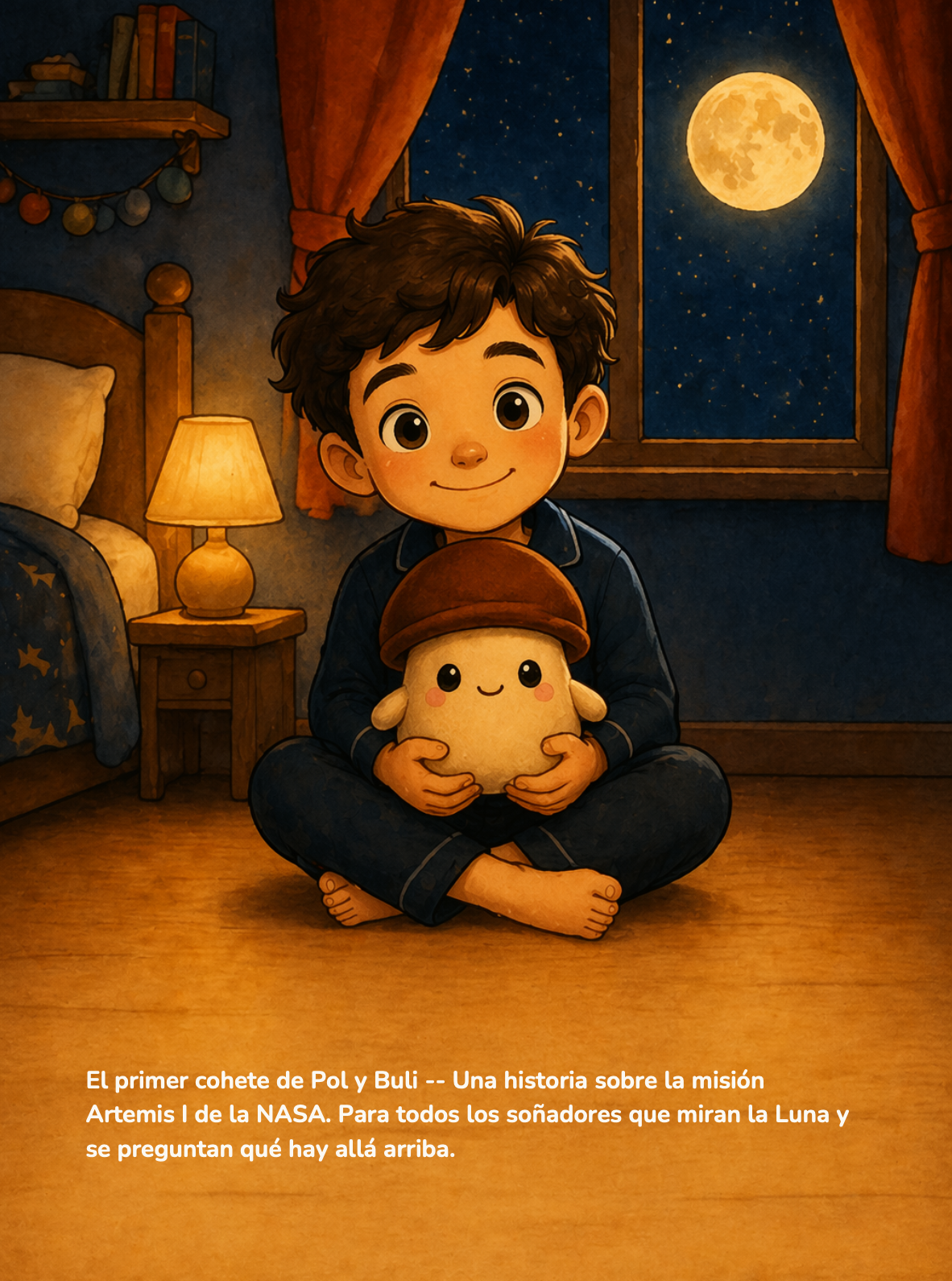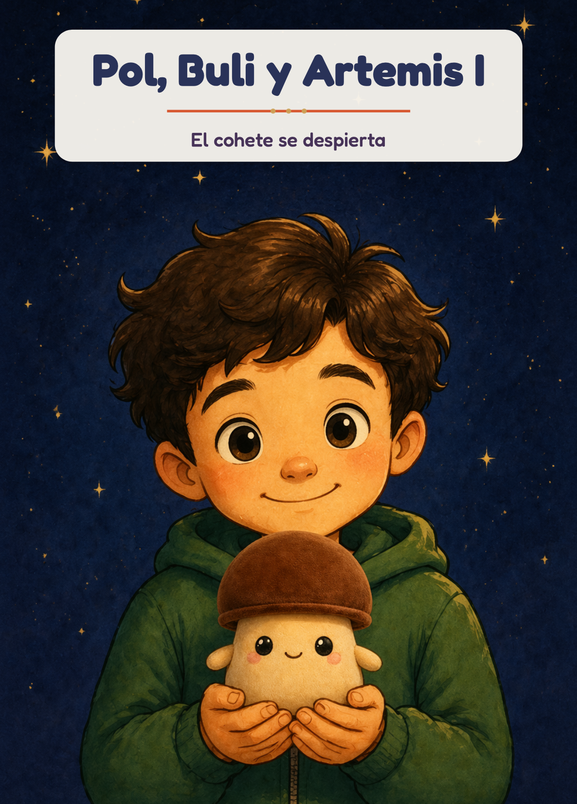 Hecho con dos fotos: Pol (4 años) y Buli, su peluche seta. Estilo cartoon 2D. 20 páginas. Listo en 4 minutos.